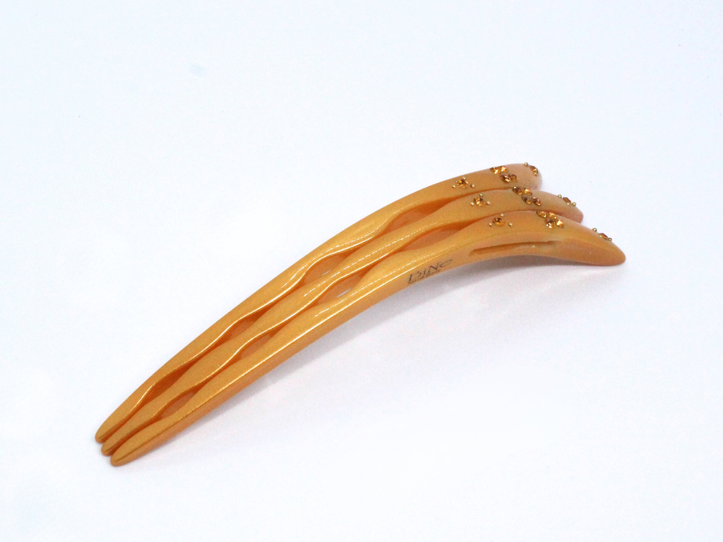 Three prong hair comb in gold color, hand decorated with 18 crystals & 18 small metal balls